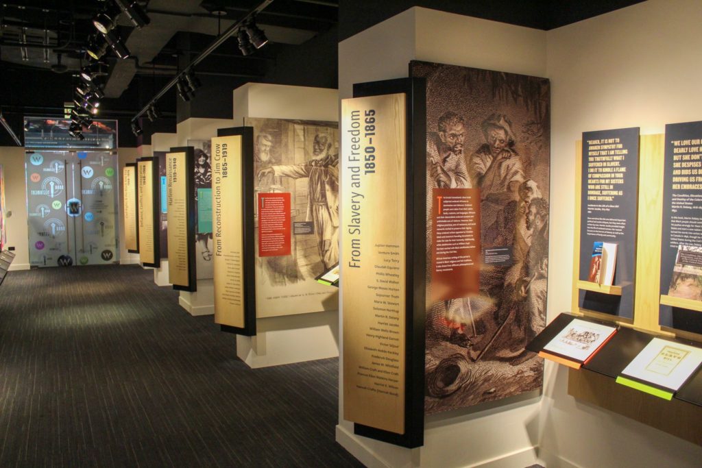 The Meijer Gallery provides a visual, audio, and interactive exploration of major writers during important historical eras. This gallery includes commissioned works of art by local artists. These include works by: Dorothy Burge; Damon Reed; Dorian Sylvain; and Bernard Williams. Also, a variety of musical selections from the past help to further contextualize the literature of each era; from spirituals, to Blues, to Jazz, and funk.