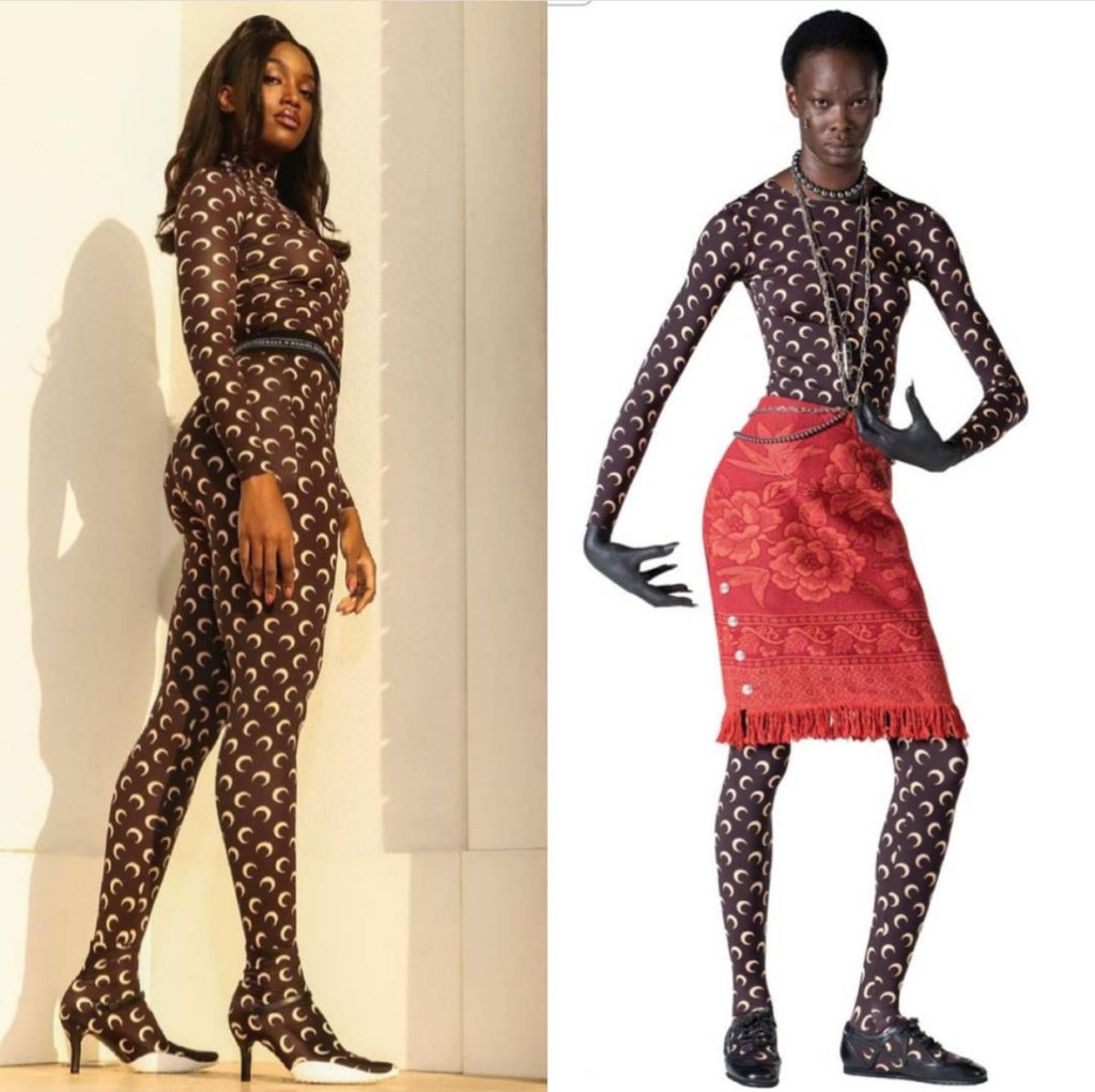 The Item: Energetic singer and songwriter IZA turned heads in a Marine Serre Summer 2021 brown tone chic design featuring the brand’s now iconic upside down Crescent Moon logo!